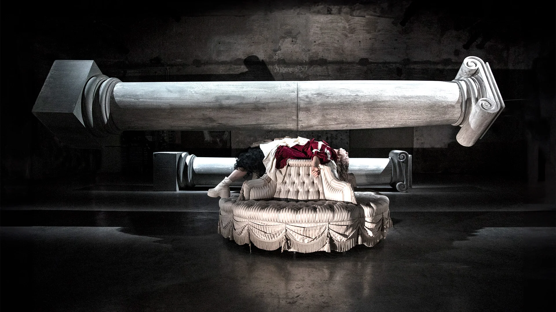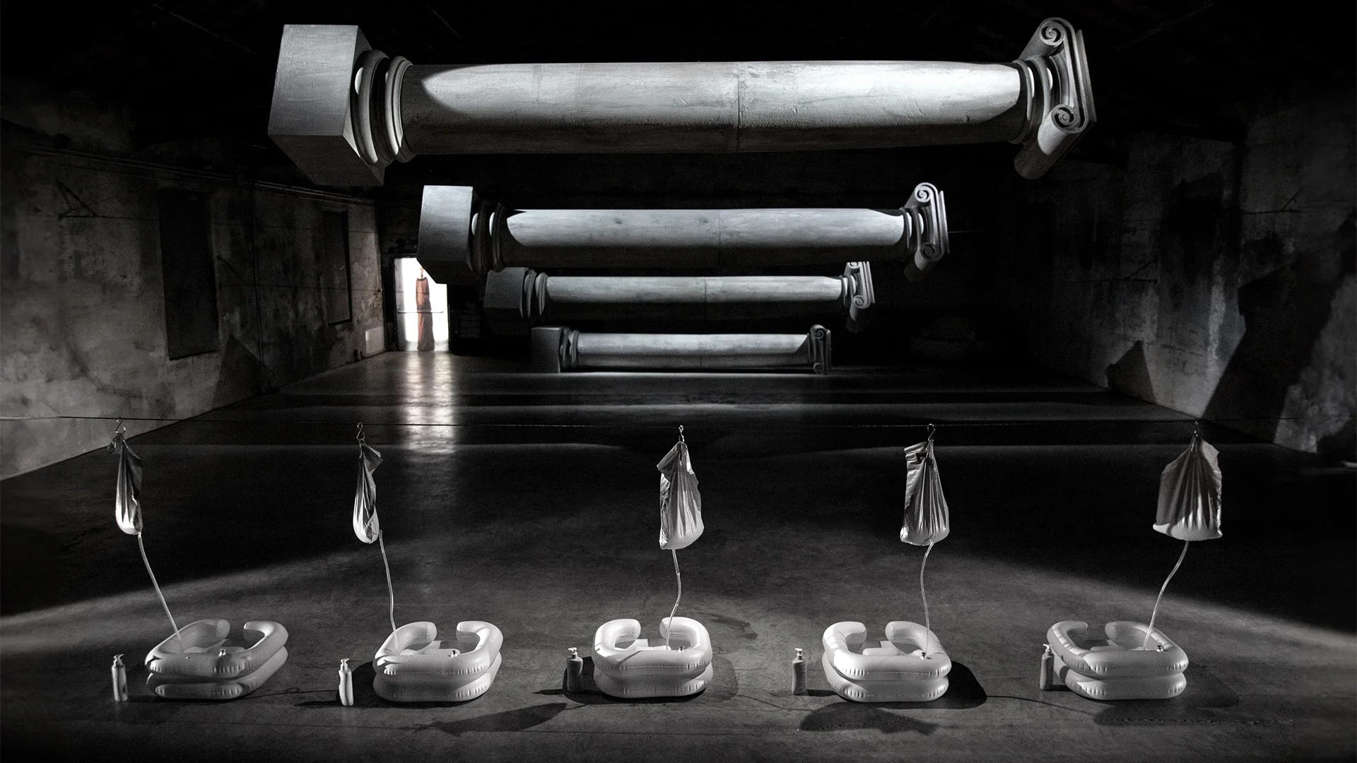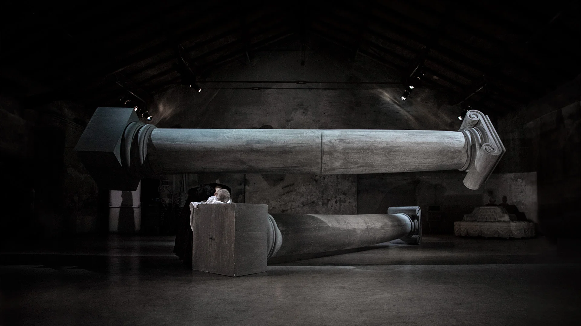 Suspended horizontally in an interior marked by workers' work at the time of the first industrial machinery, the columns exfiltrated from the façade of the Venetian Church of Maddalena, Jesus' favorite wise disciple, establish an exorbitant, excess space, deviating from the vertical rule useful to the obedient faithful, kneeling and dreamless.