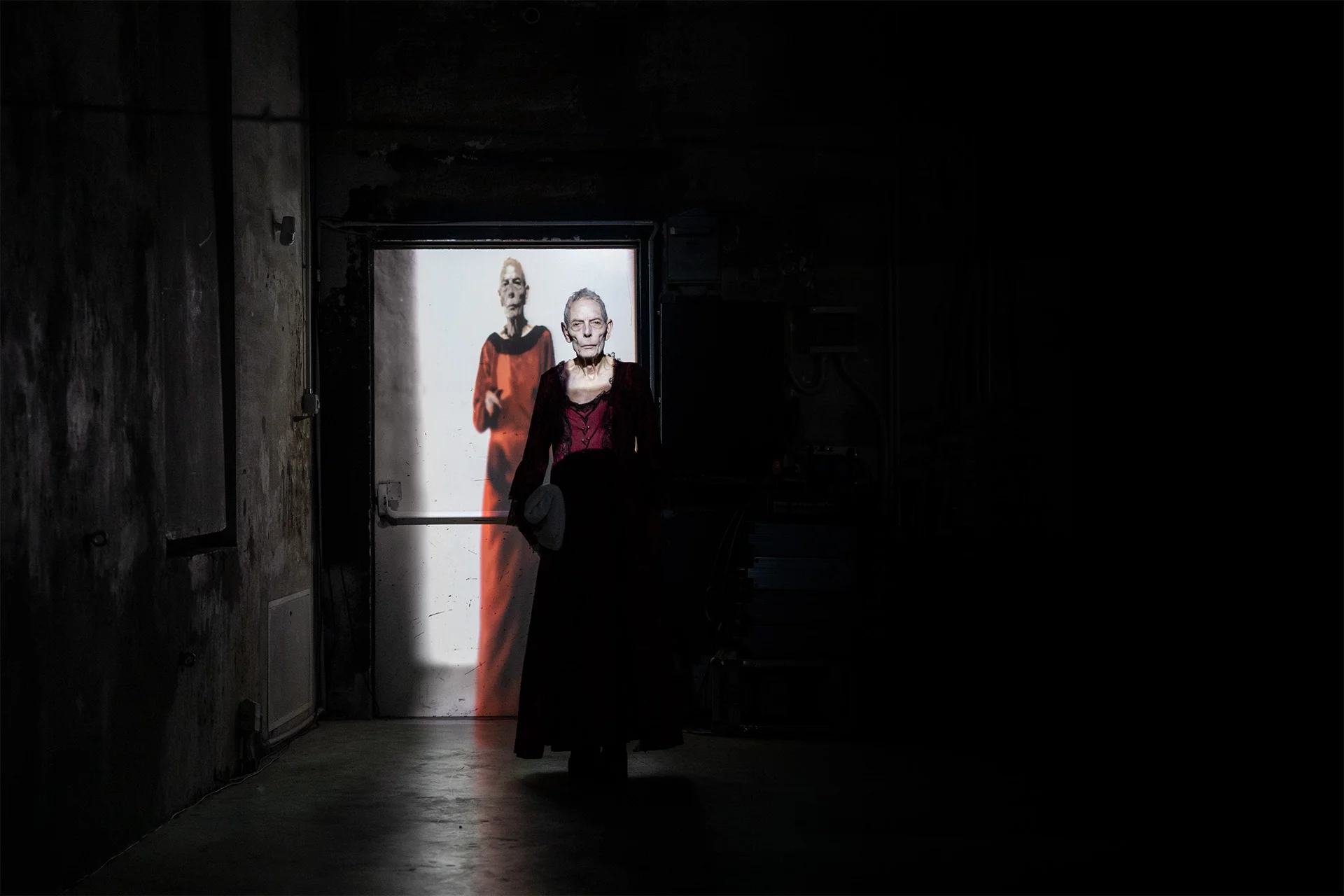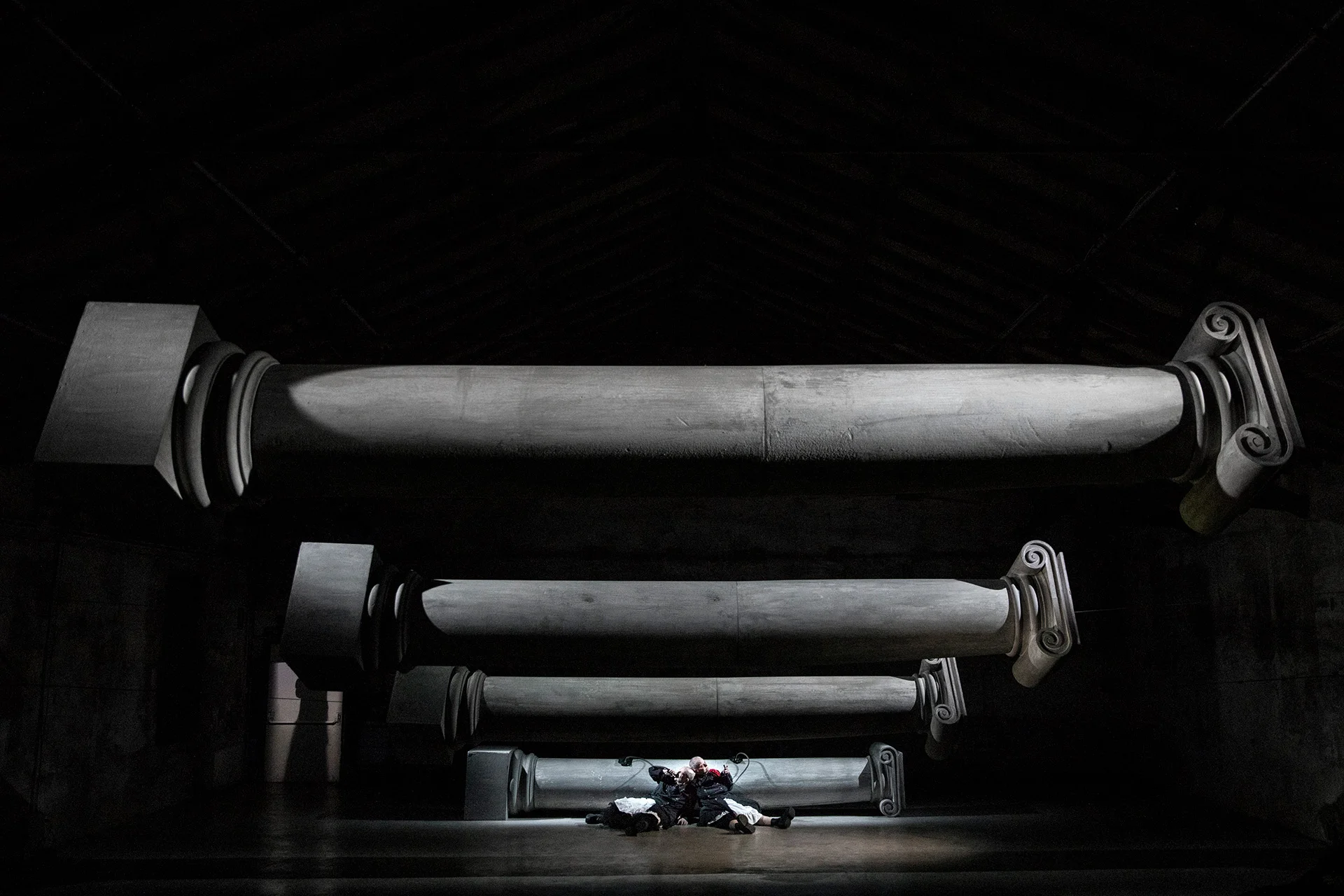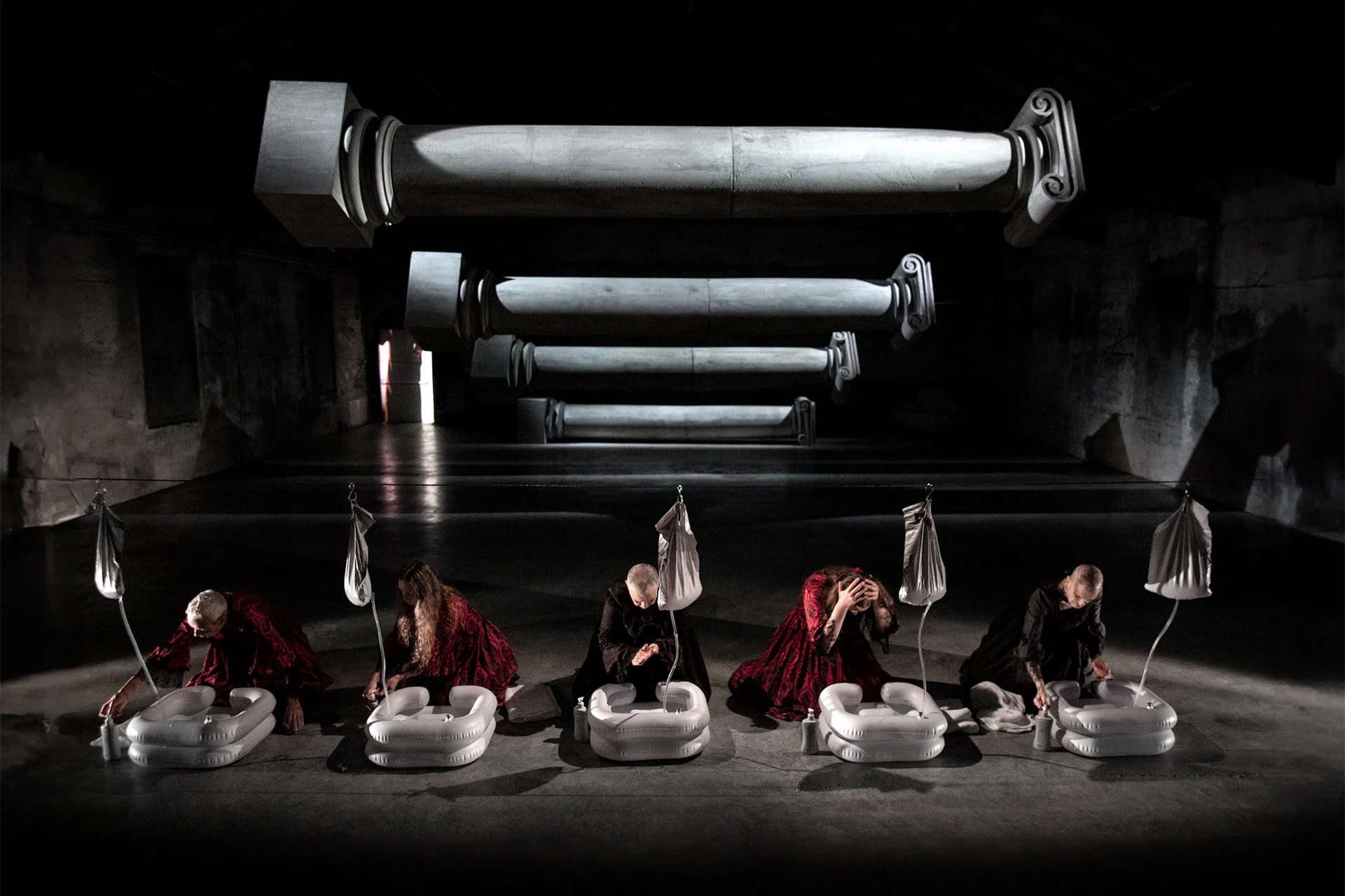 Suspended horizontally in an interior marked by workers' work at the time of the first industrial machinery, the columns exfiltrated from the façade of the Venetian Church of Maddalena, Jesus' favorite wise disciple, establish an exorbitant, excess space, deviating from the vertical rule useful to the obedient faithful, kneeling and dreamless.