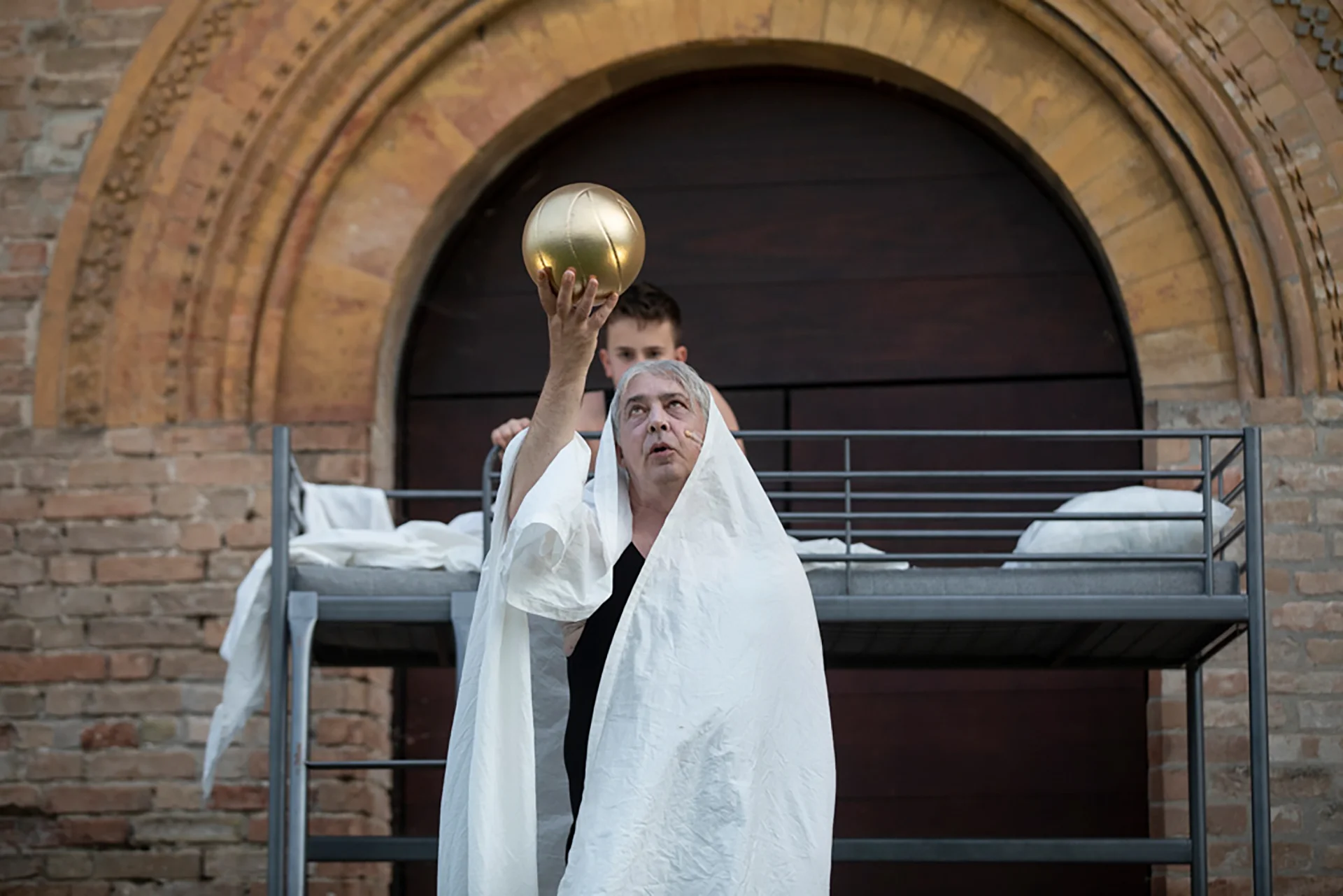 In the new staging at the Valserena Abbey, as already in the two autos sacramentales The great theatre of the world and La vida es sueño in site-specific at the Pilotta Monumental Complex in Parma, the sensitive actor –together with adolescent and elderly performers – becomes a central figure of dramaturgy, of the mise en site, of the profound meaning of theological-philosophical drama. Already in the autos, the poetic presence of the figures of the Poor and Man foreshadowed the protagonist Sigismund in the dual role of man/child. In the drama, again, the themes of illusion, mortal time “from cradle to grave” and “free will” are developed according to the privileged vision of innocent sensitivity, of the unmediated act, of the word that presents itself as sound even before defining itself in the sense.