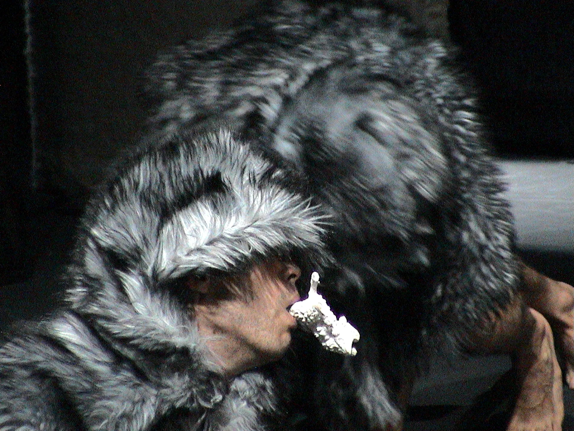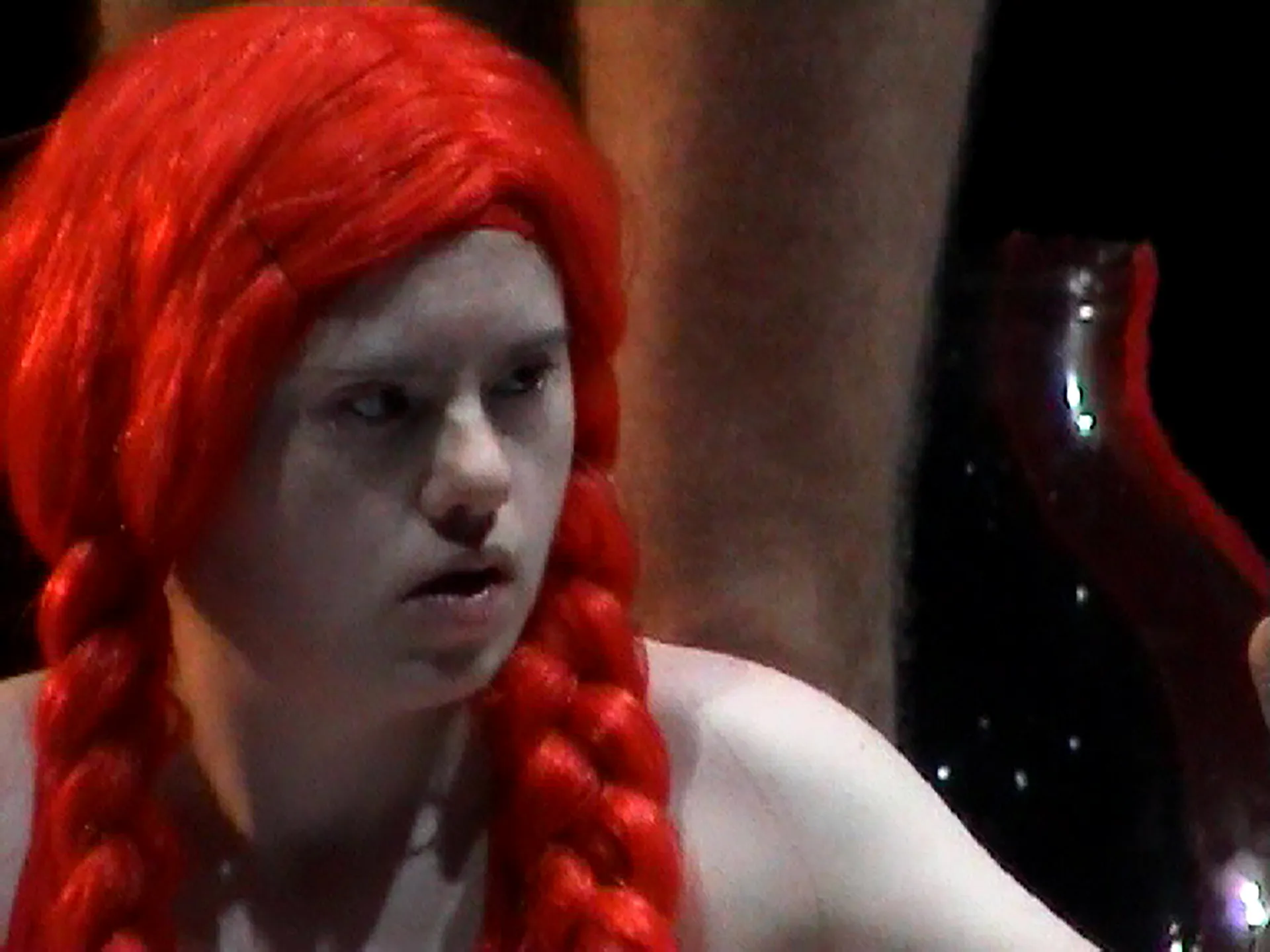 In broken and separated addition surfaces, the chromatic surfaces are evolutionary mechanics of the fairy tale scene. The set is black occlusion, it's moral blindness, it's the black side of the human record. Connected by nature to the other side, the red, access of dramatic artery, compensating exteriority that rises in the center to pronounce the cut of the acute-angle field. Identical in hairy absoluteness, the dark and light are recognized as plasters of the living and the dead. The light creeps into the darkness and reveals the fleece of every stanza. The path sprinkles the white sequence, with narrative desolations, visual colorblindness of the red kingdom. Suspended in black are the plastered mummies of sheep and lambs piled up in the mortuary for which the little girl is destined. Solitary are shown the pizza of Son of God-Mother, which tastes of bread and blood, and the cake prepared as a benefactor of the genetic colonnade. The Father God-Old Mother is refreshed by the bumps of sour foam rubber dripping with artificial chantilly, inedible food of eternity.