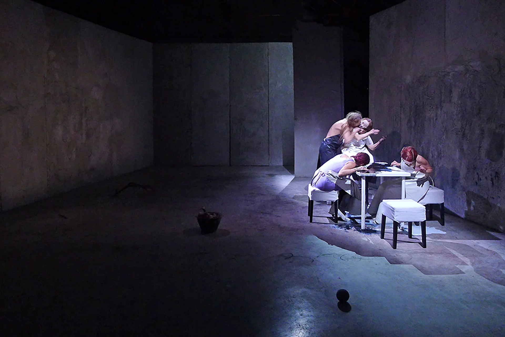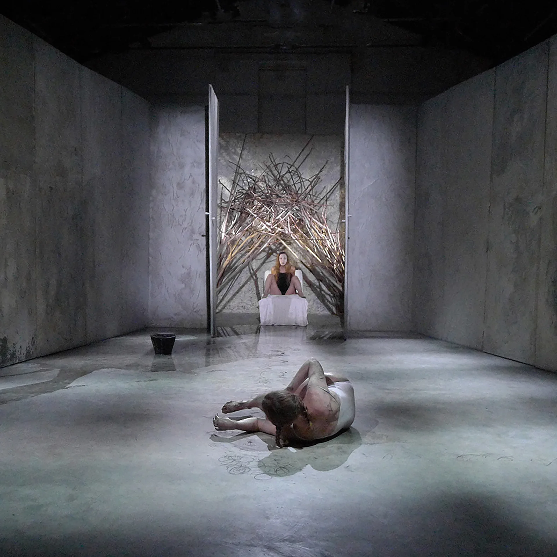 In Latte, the second episode from Le Coefore, the stage installation prepares – symmetrically to the nest/bed inhabited by the mother Clytemnestra – some ordinary and active elements of domestic physics: an artificially nutritious board – flooded by the black milk of hatred inspired by Paul Celan's Todesfuge and Anish Kapoor's liquid vortices – and the lair/cradle in which Orestes will hide to escape the fury of the Erinyes.