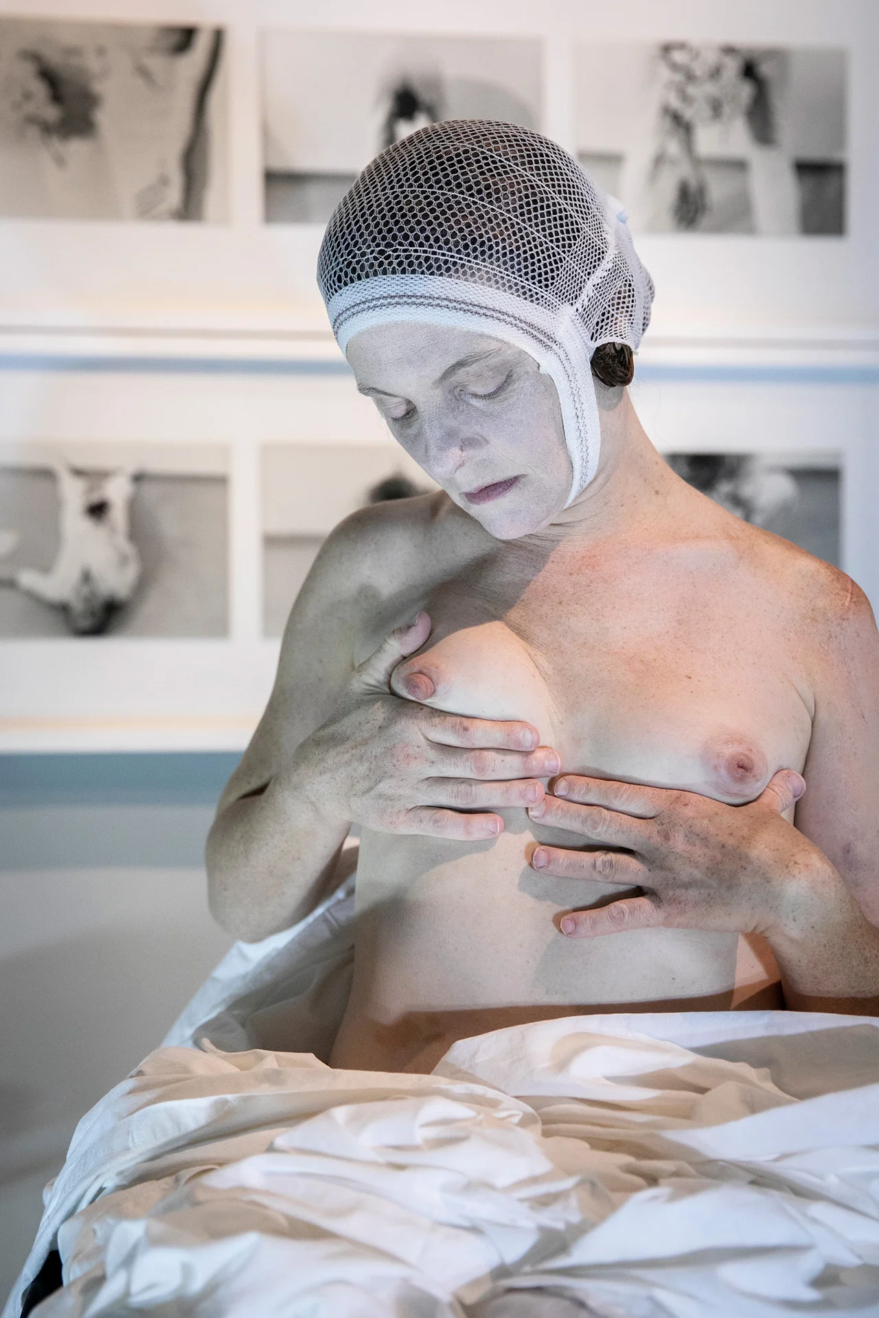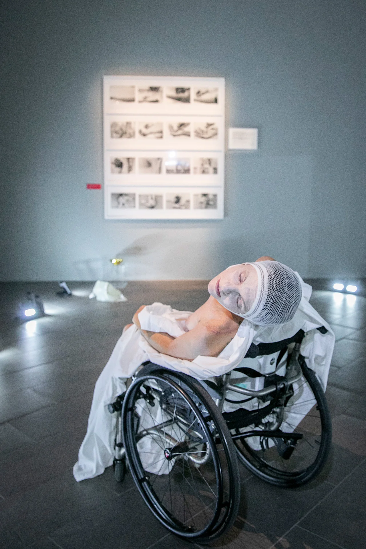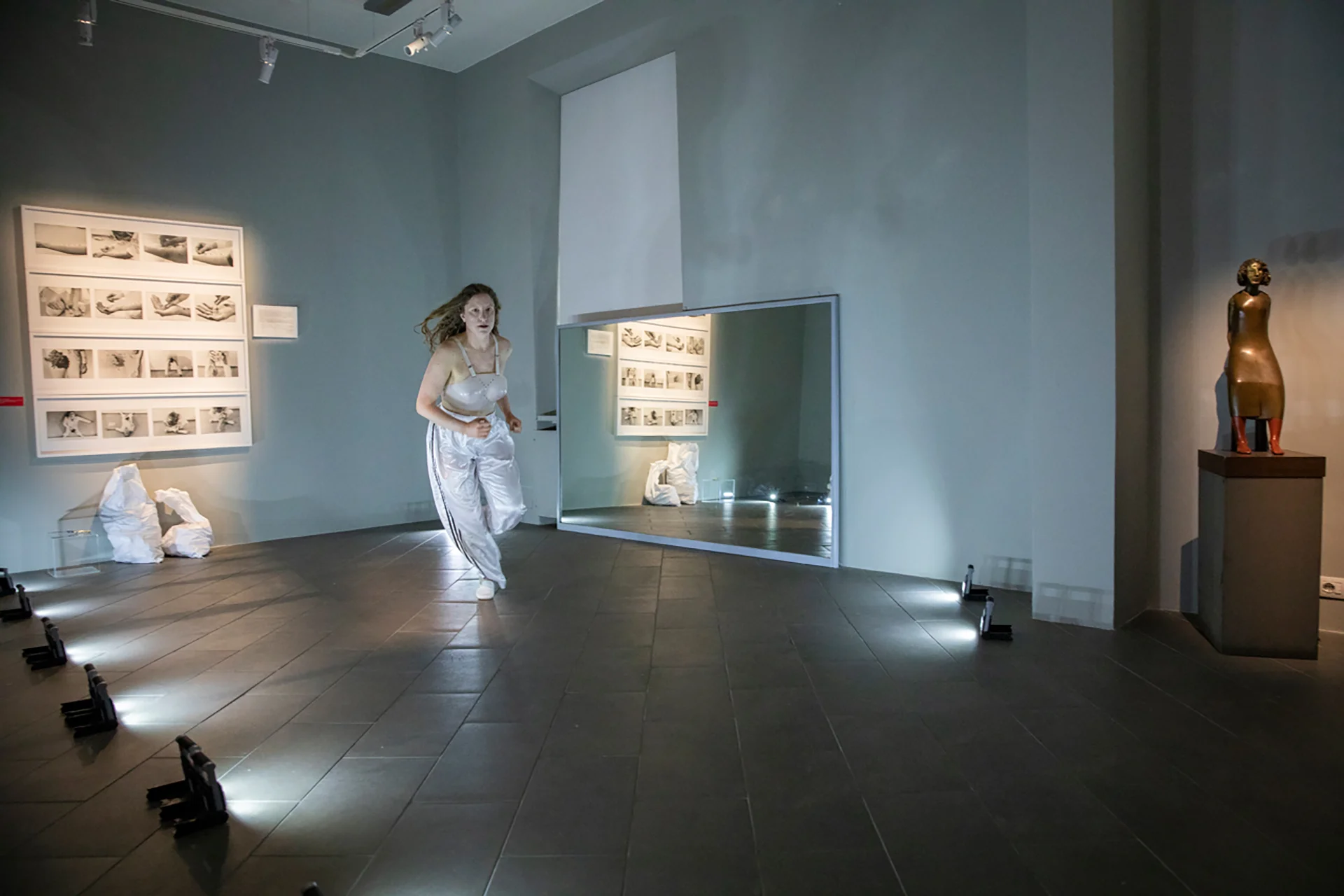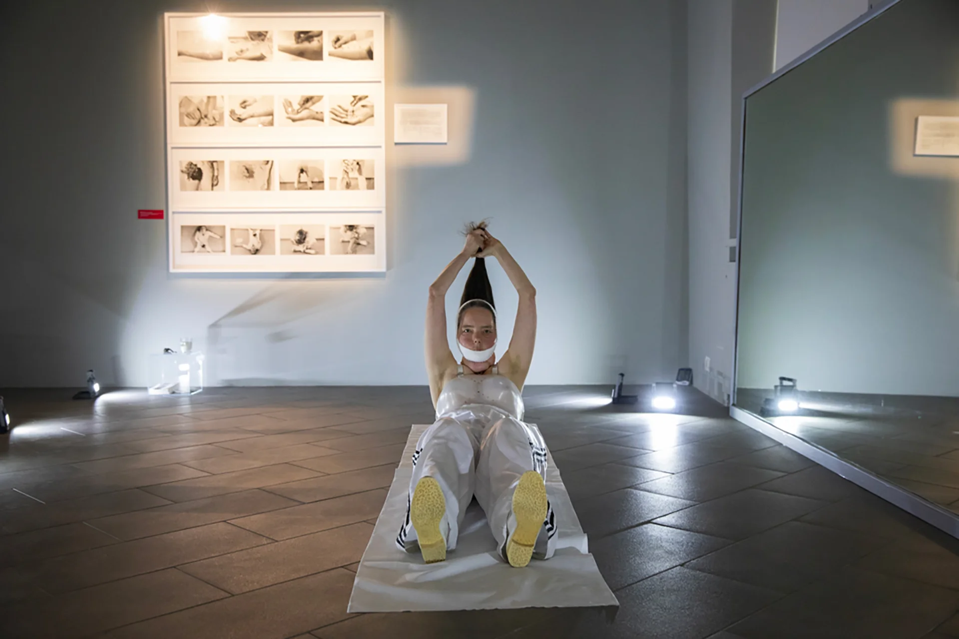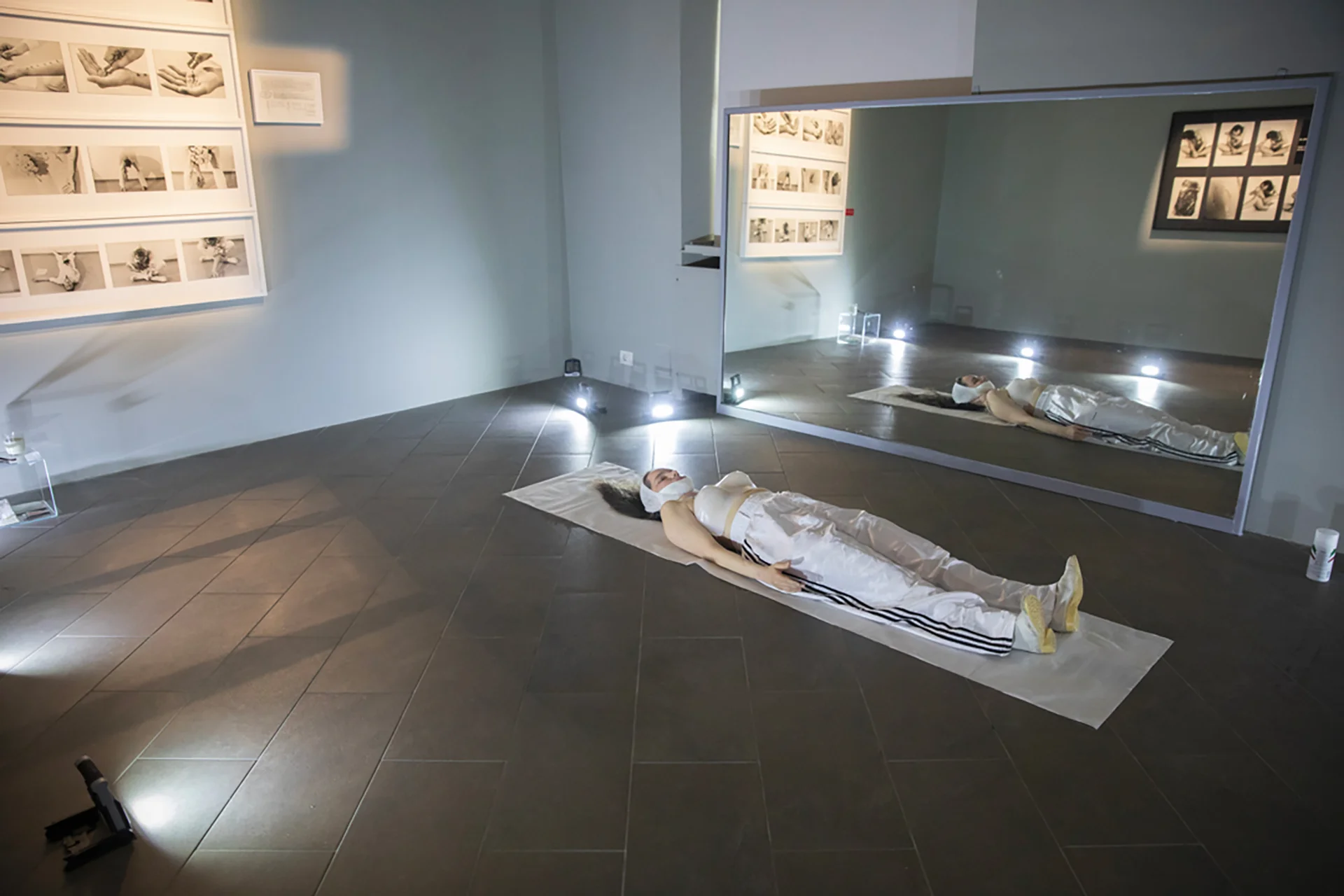 Maria Federica's four performers in ‘Over Gina Pane_4 Sentimental Actions’ acted in the same habitat where Gina Pane's Observations were exhibited and themselves become body refractions of that photographic score placed on the wall.
