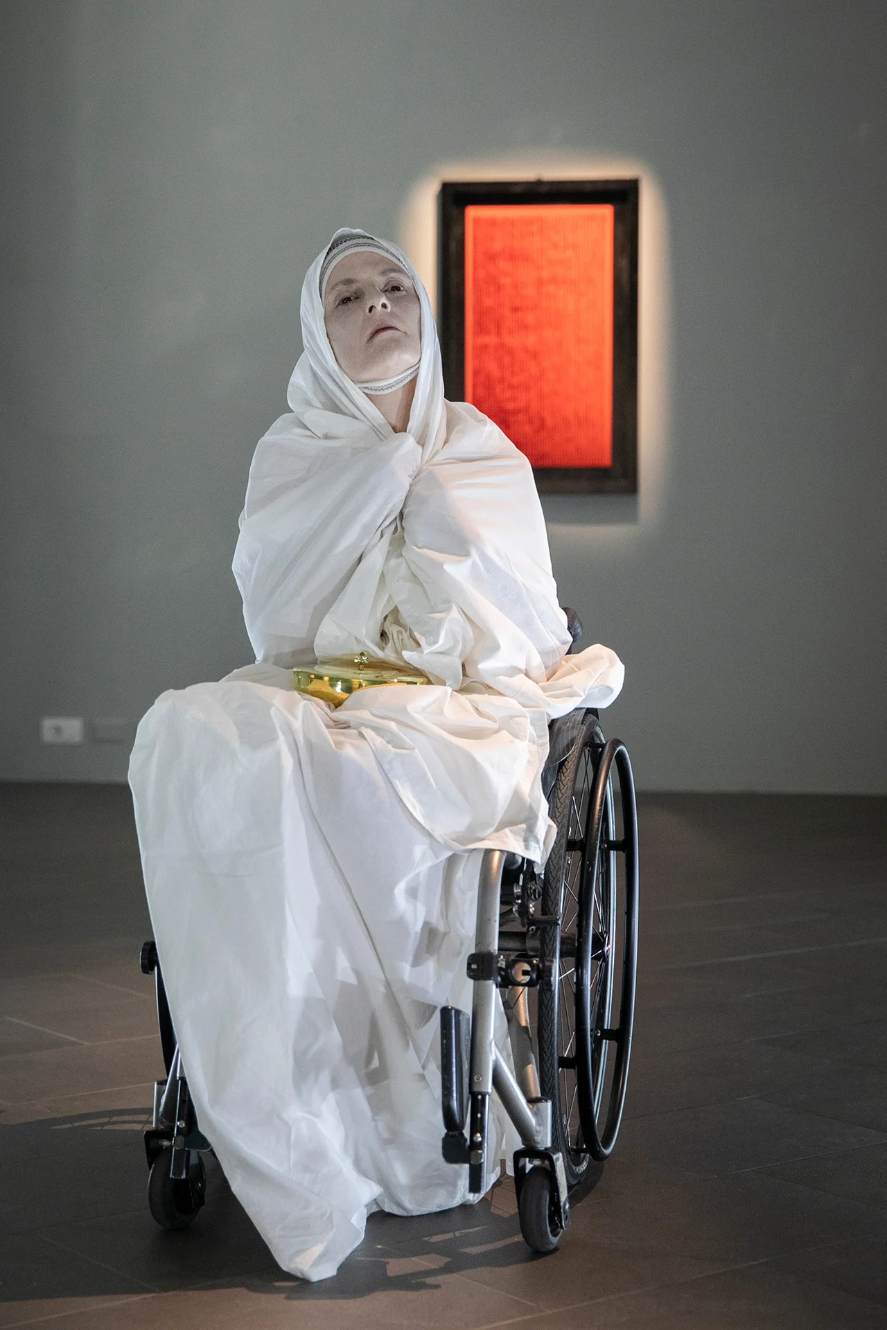 I think of the convergence between the skin cracks of Gina Pane and the cuts of Lucio Fontana's canvases. In these 4 Sentimental Actions the blood takes on the suspended dimension of waiting (‘Waiting, Red Spatial Concept’, Lucio Fontana 1965) and of memory, the outcome of the wound is transformed into a spatial concept, into emotional architecture perceived in the present, into the persistence of the performative act. In this iconostasis of ours we do not use violence against bodies, so already tremendously violated and saddened, we do not praise immolatory martyrdom, we have no sins to atone for, we do not want to be ‘Criste’. We reject the saving function of the cross, on the contrary we understand the artistic act as an act of rebellion against suffering, both in its individual inevitability – derived from physical and mental pathologies – and in its collective dimension – caused by the violence that victims of wars, racial, social or religious persecution suffer.