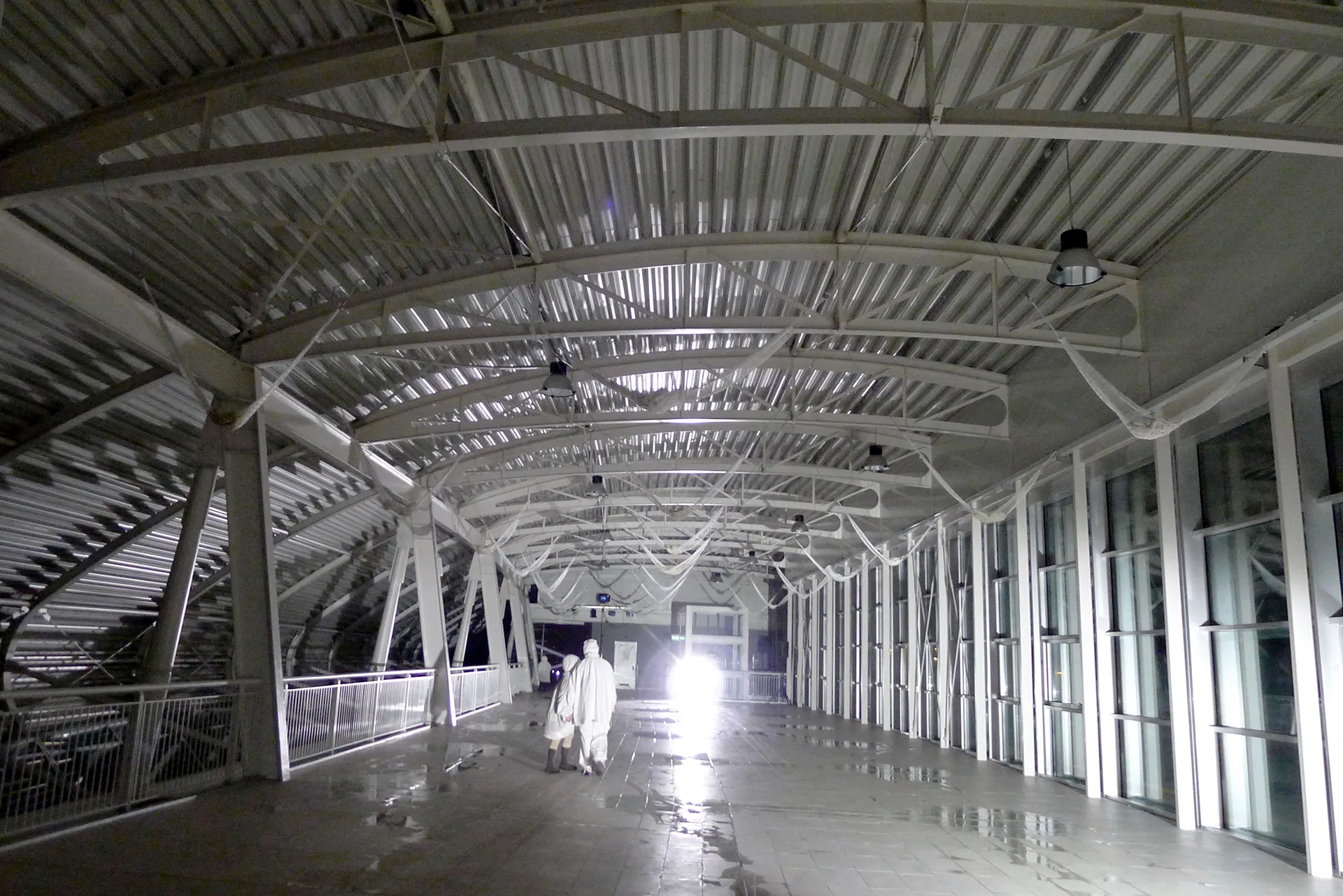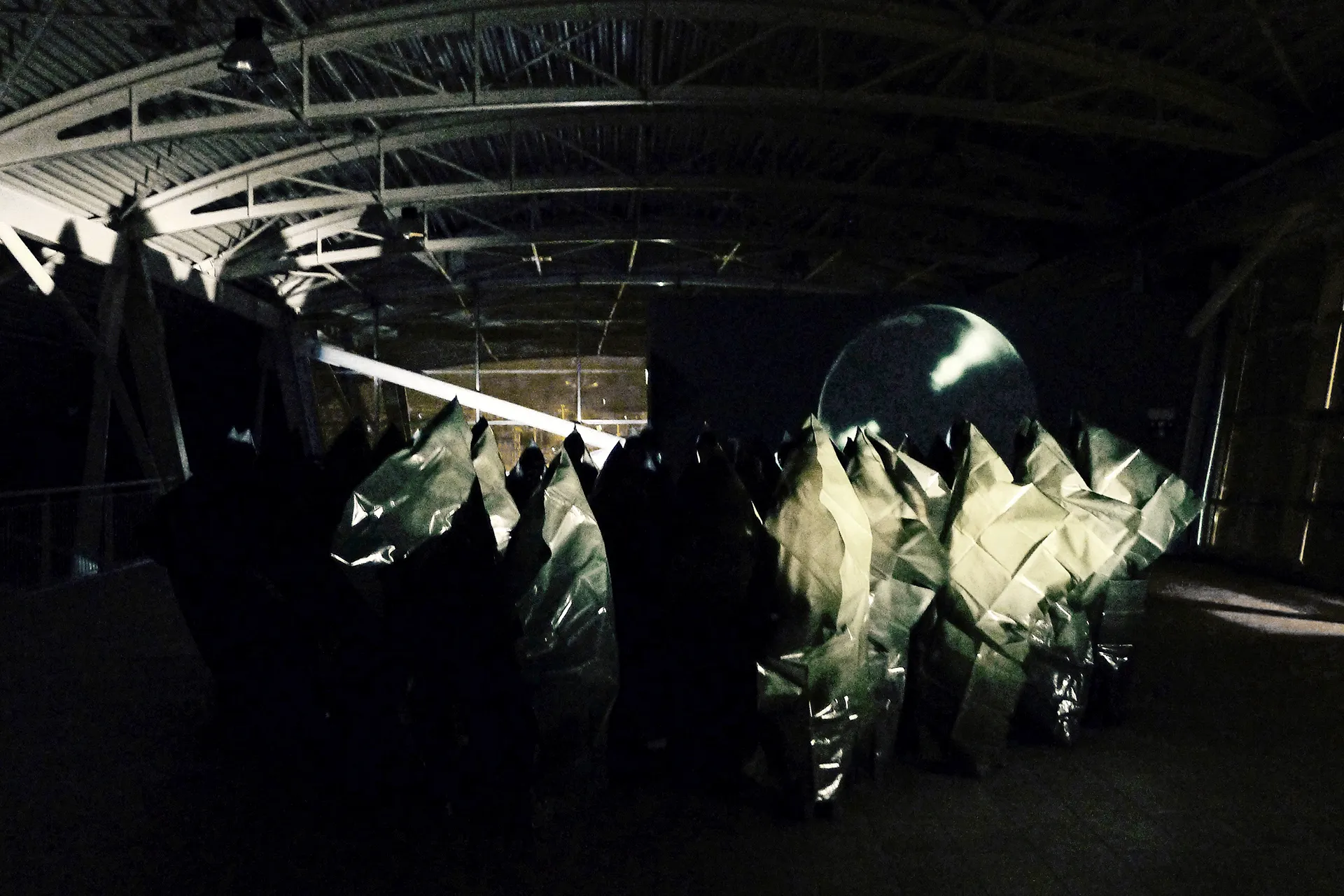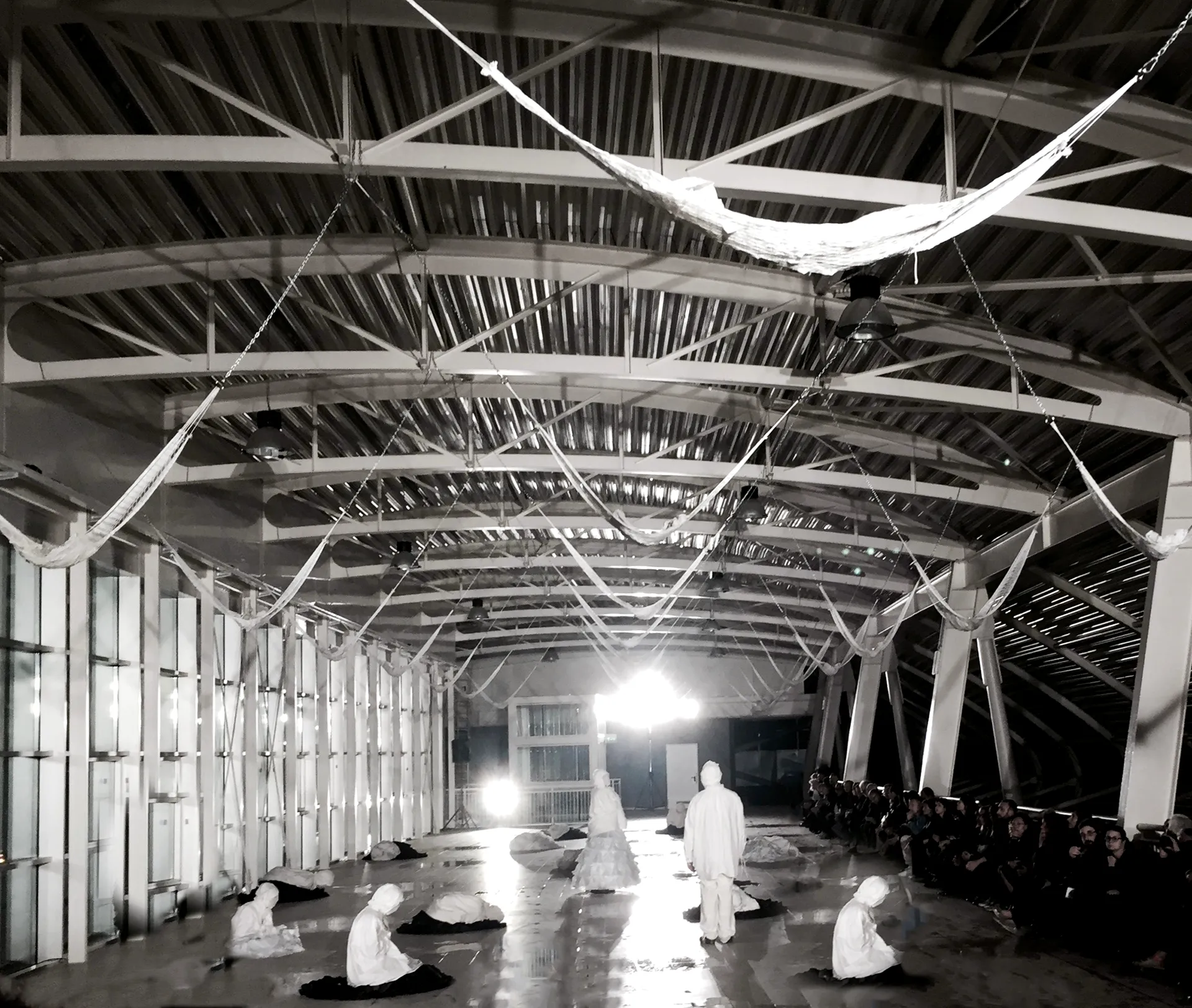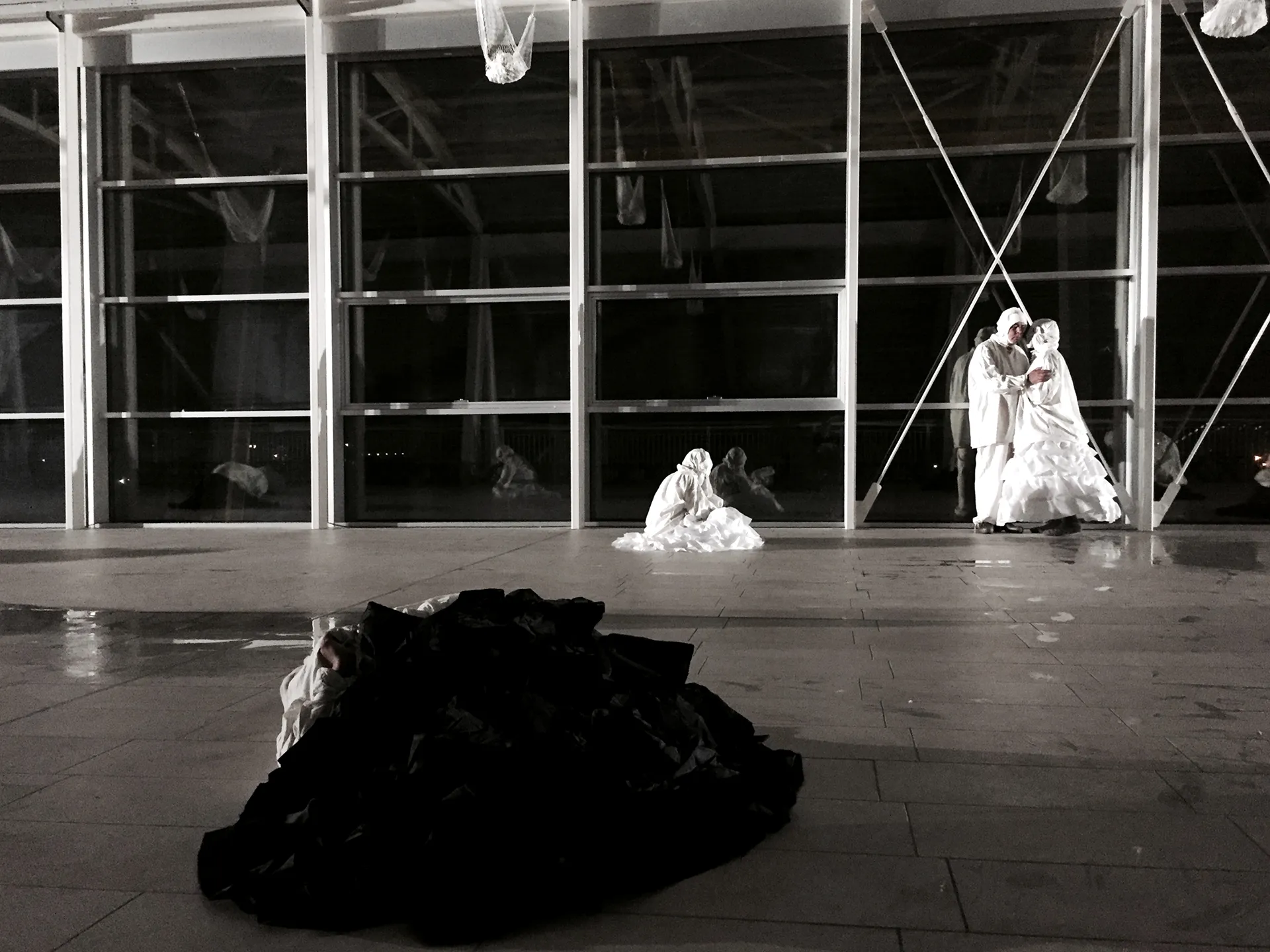 The water flows into the bridge like amniotic sac water that contains the living being. Benedictus fructus ventris tui_ In the evident biological impossibility of conception embodied by our Mary, curved by the weight of the years and by the chorus of elderly women, the philosophical nature of motherhood is manifested: the tension to become two, to transform into new, into something else, into unknown. Bodies, voices, thoughts inside soft envelopes lying on the ground to outline minimal boundaries, to protect faceless identities. Individual voices evaporate from the bags and in the air they touch, add, overlap.