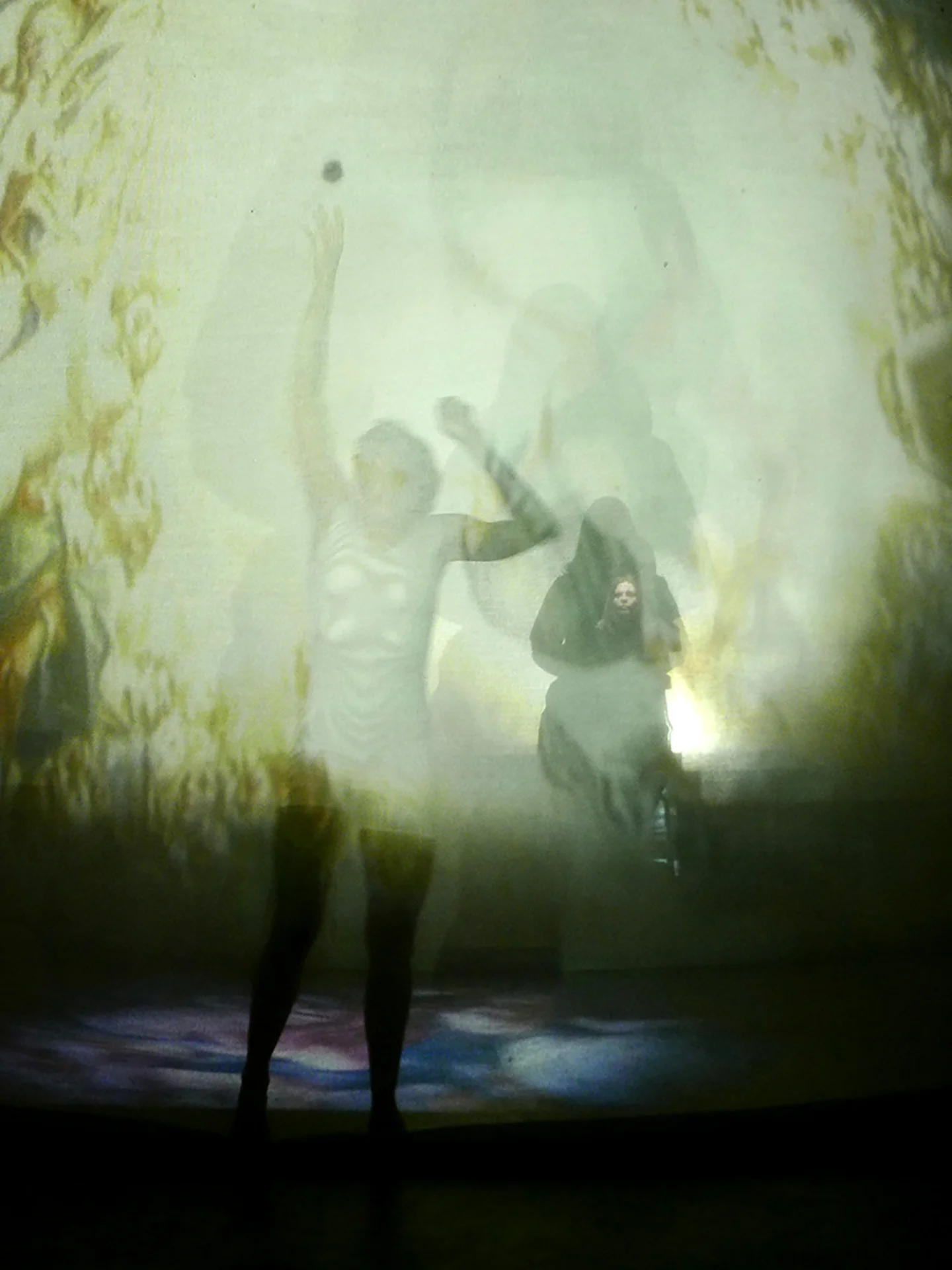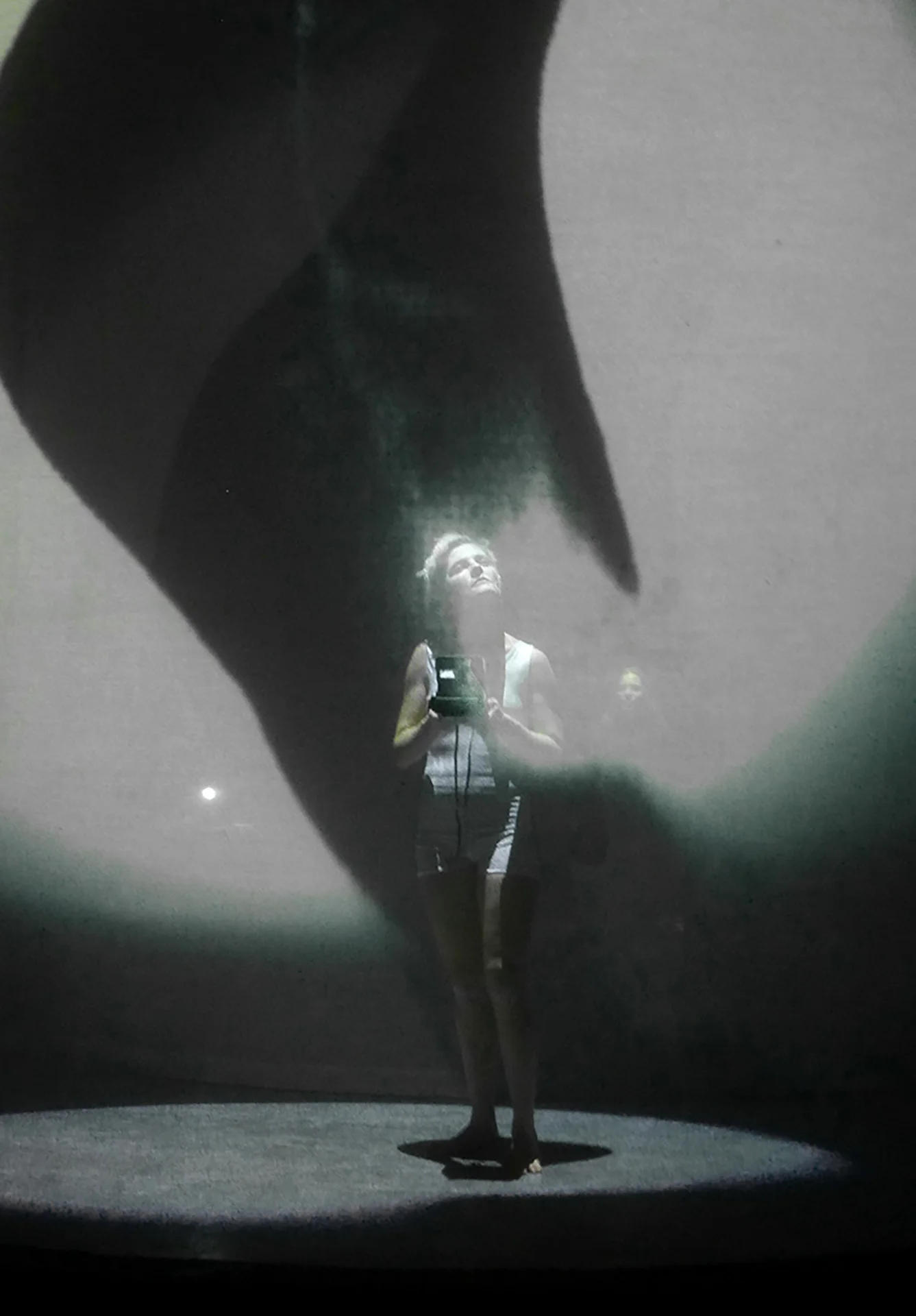 The double transparent and semicircular veil of the scene houses the image, contains it and curves it as spacetime bends to the mass of bodies, in the four-dimensional scene where time fluctuates between a before and an after, and at the same time matter and image fluctuate between past and present.