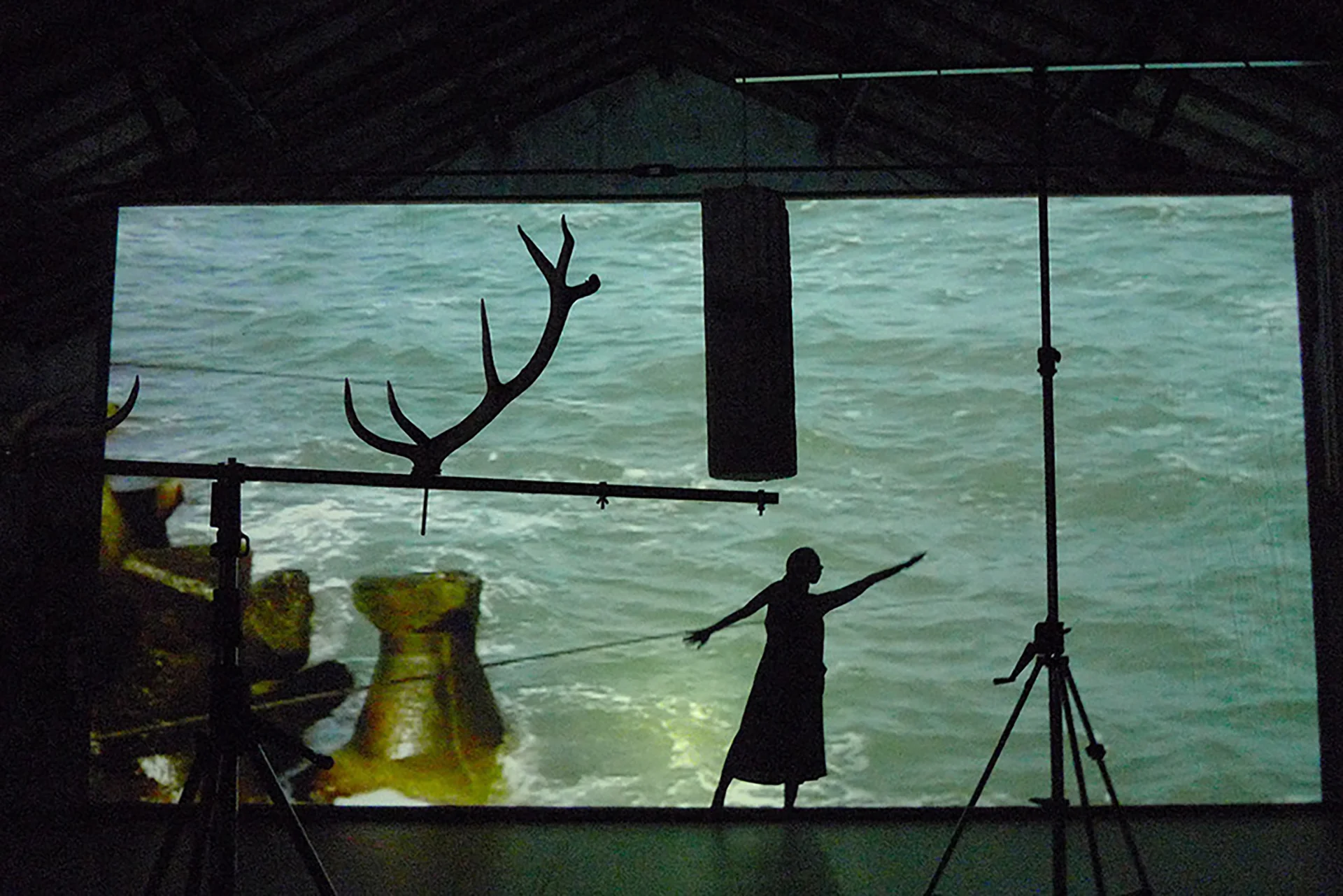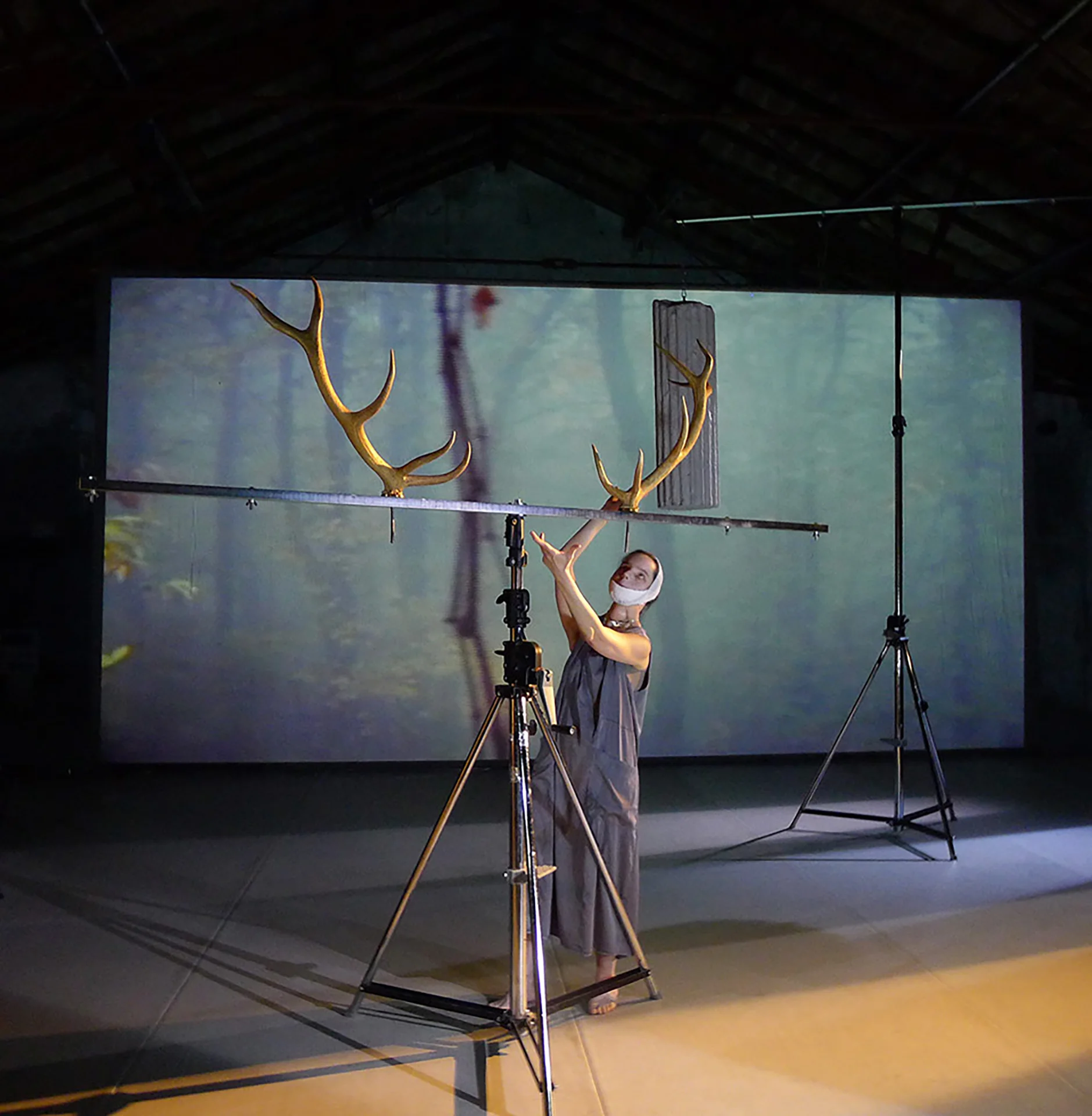 Nel centro dell'area scenica, sospese tra i rami metallici di piante meccaniche, si stagliano le corna della cerva sacrificata al posto di Iphigenia, il giorno in cui il padre Agamennone, per propiziare la partenza delle navi alla volta di Troia, aveva deciso di sgozzare la figlia.