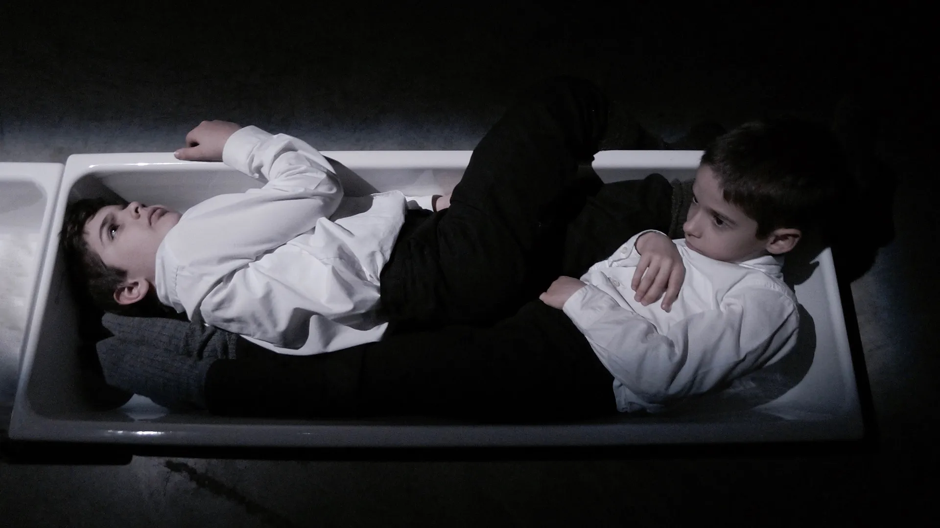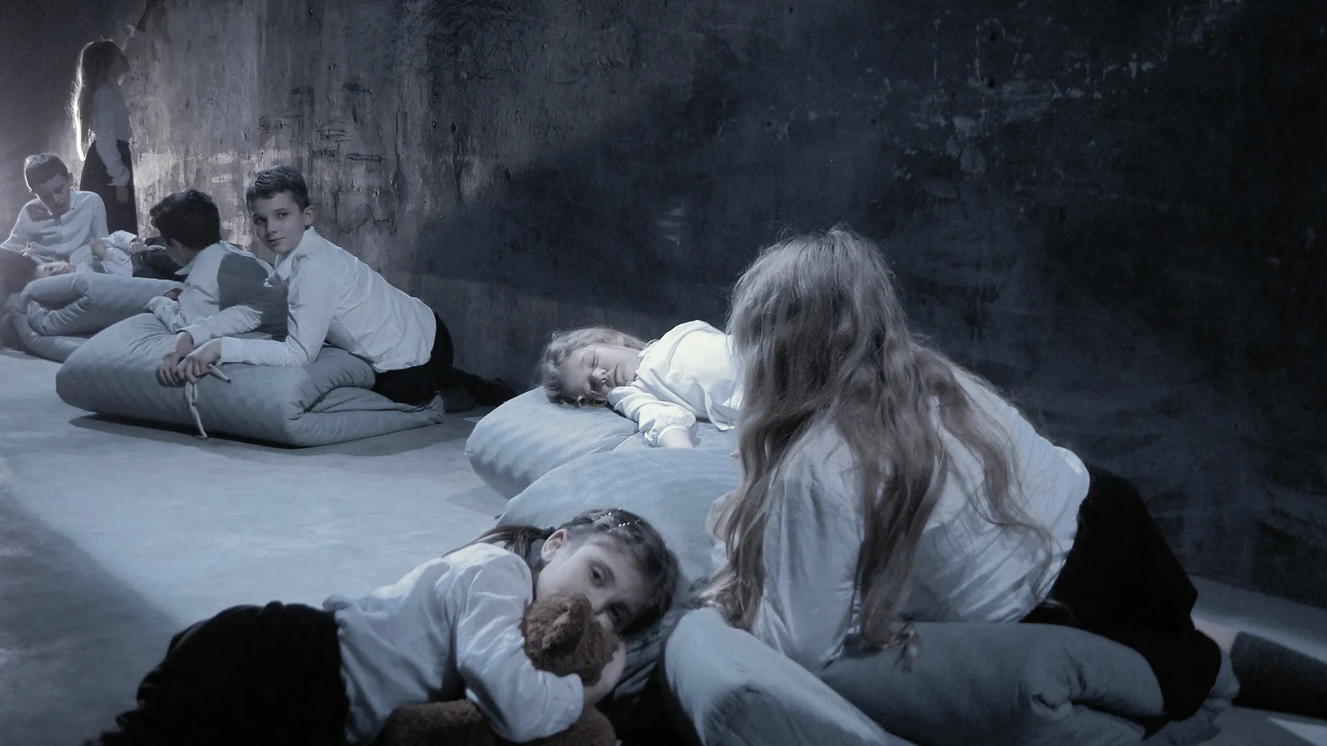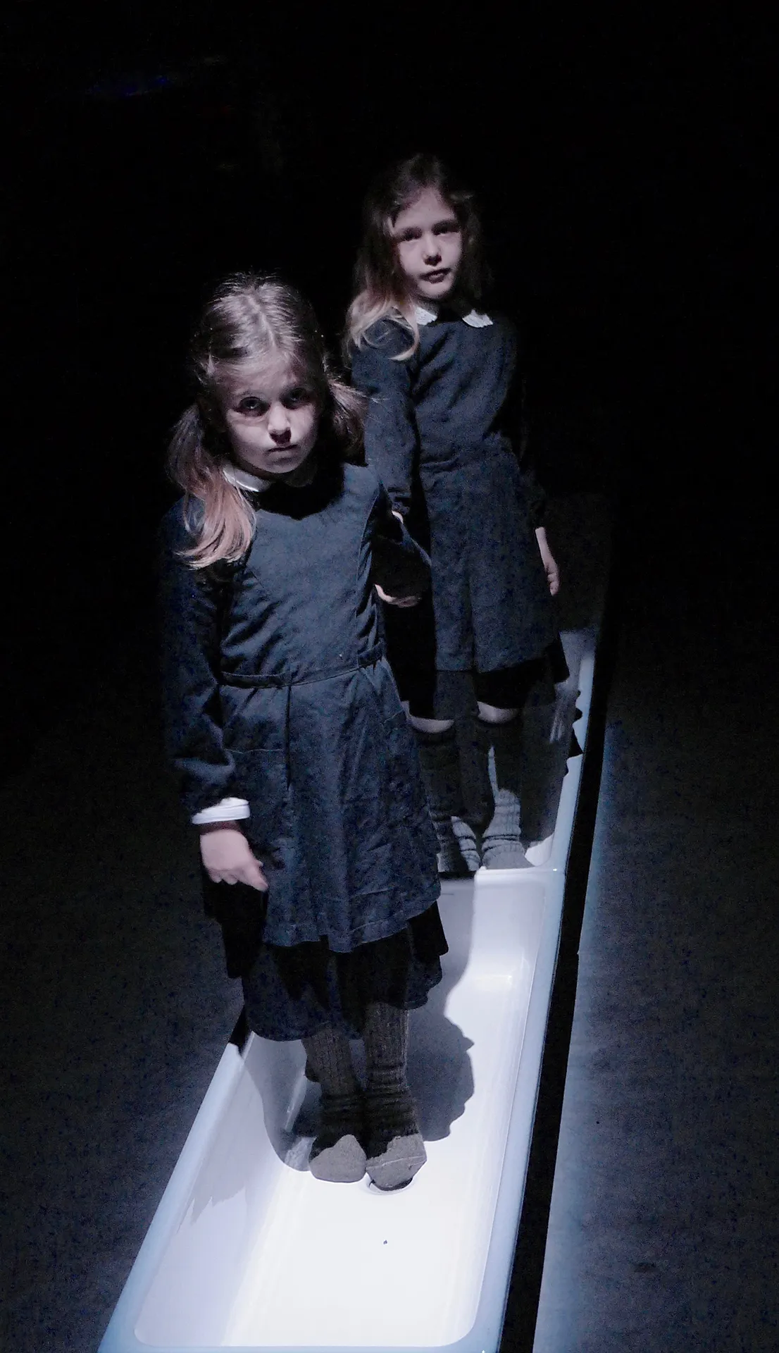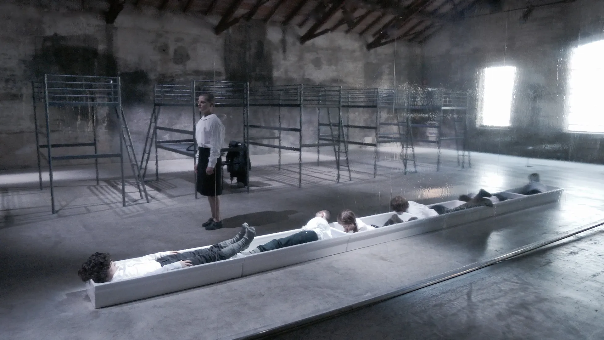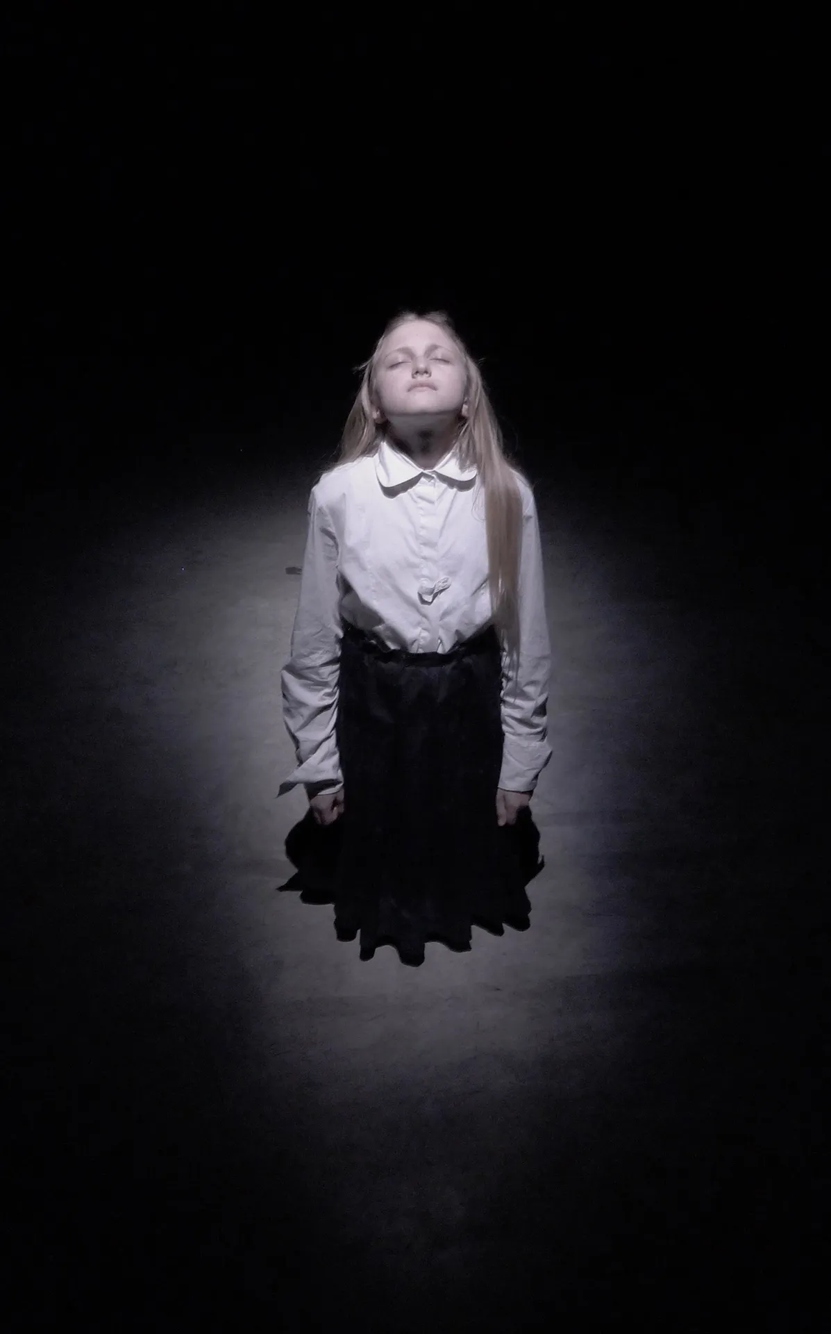 La drammaturgia di KINDER contiene diverse parti di questa Storia: l’elenco dei campi di lavoro e di sterminio, le lettere di una madre al “Signor Questore della Provincia di Parma”, poesie anonime di bambini ebrei dei campi, dialoghi immaginari tra i bambini di Parma con altri due bambini dei campi, Tereszka e Papo, una versione ritradotta di “Tenebrae” di Paul Celan ma il nucleo drammaturgico rimane il canto. Ed ecco la presenza/resurrezione dei bambini del Coro di Voci Bianche diventare essenza performativa insieme ad un’unica attrice, riflesso e rifrazione di sei vite troncate, tramite i loro sguardi silenziosi e poi voci recitanti e intonanti un unico Lied di Mozart/Overbeck “Komm lieber Mai_” che parla di un Maggio imminente, di violette, di giochi nella notte e nella neve, di un libero paese amato.