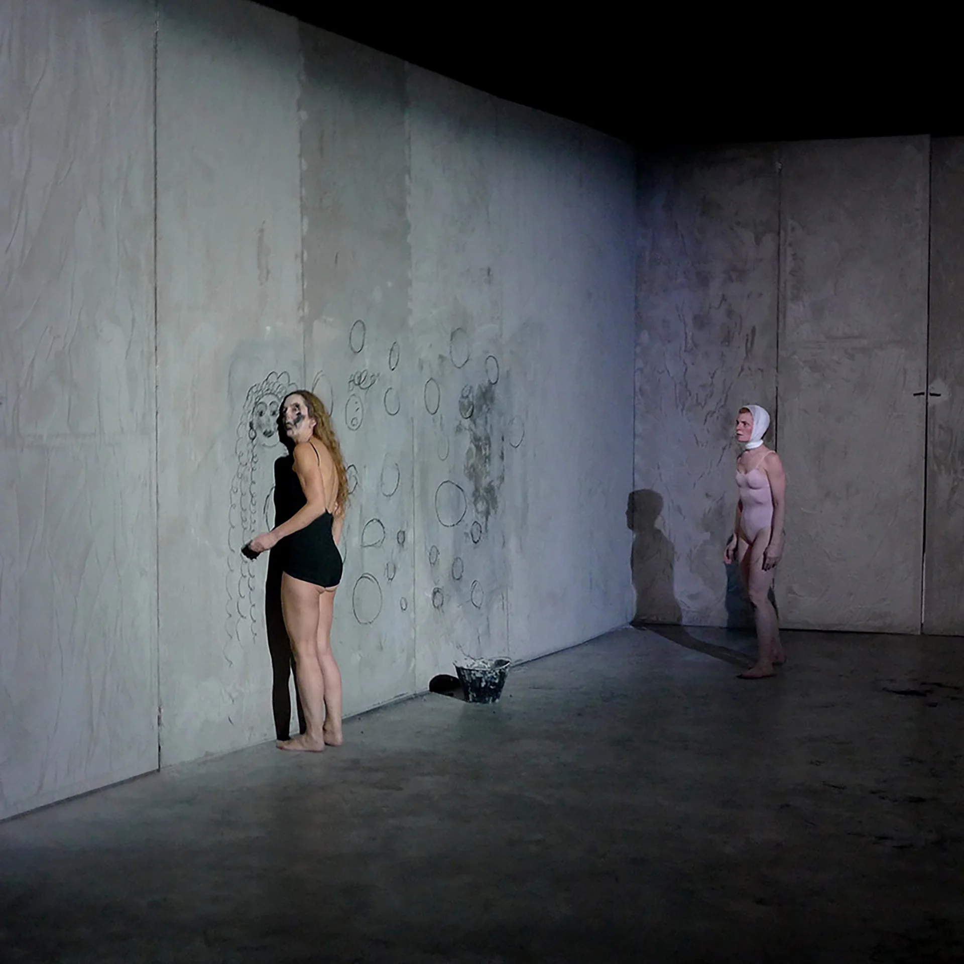 Di grande forza visiva e fisica è anche la sequenza dove sopra un tavolo domestico – luogo di nutrimento di vita e di morte – sarà composto e versato del latte artificiale che, manipolato, da bianco diventerà nero, sporcando volti e mani e lo spazio intorno. L’installazione scenica agìta s’ispira alla Todesfuge del poeta tedesco Paul Celan […] e ai vortici liquidi dell’artista inglese Anish Kapoor.