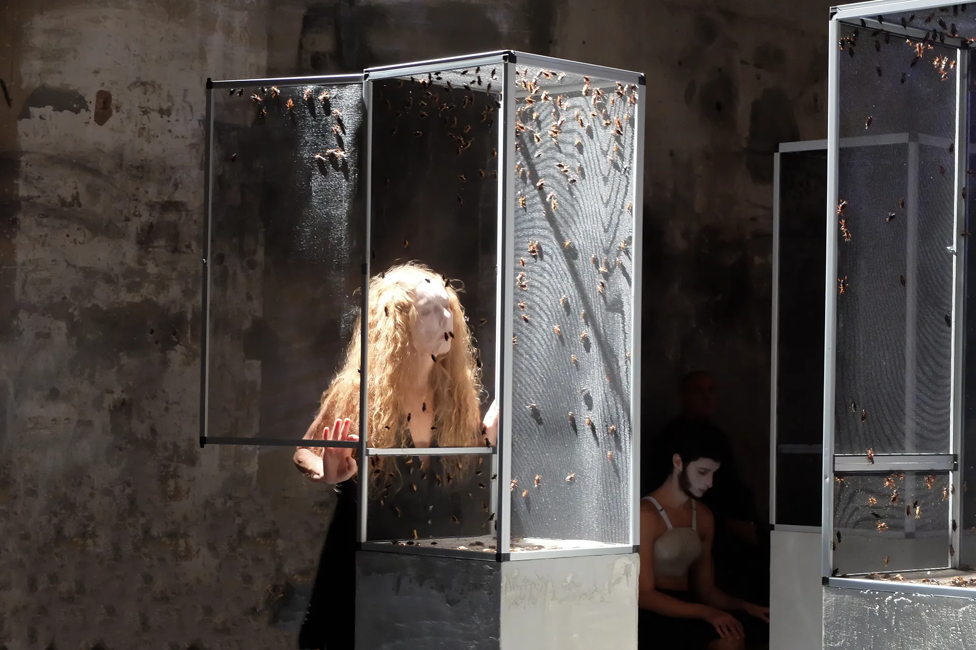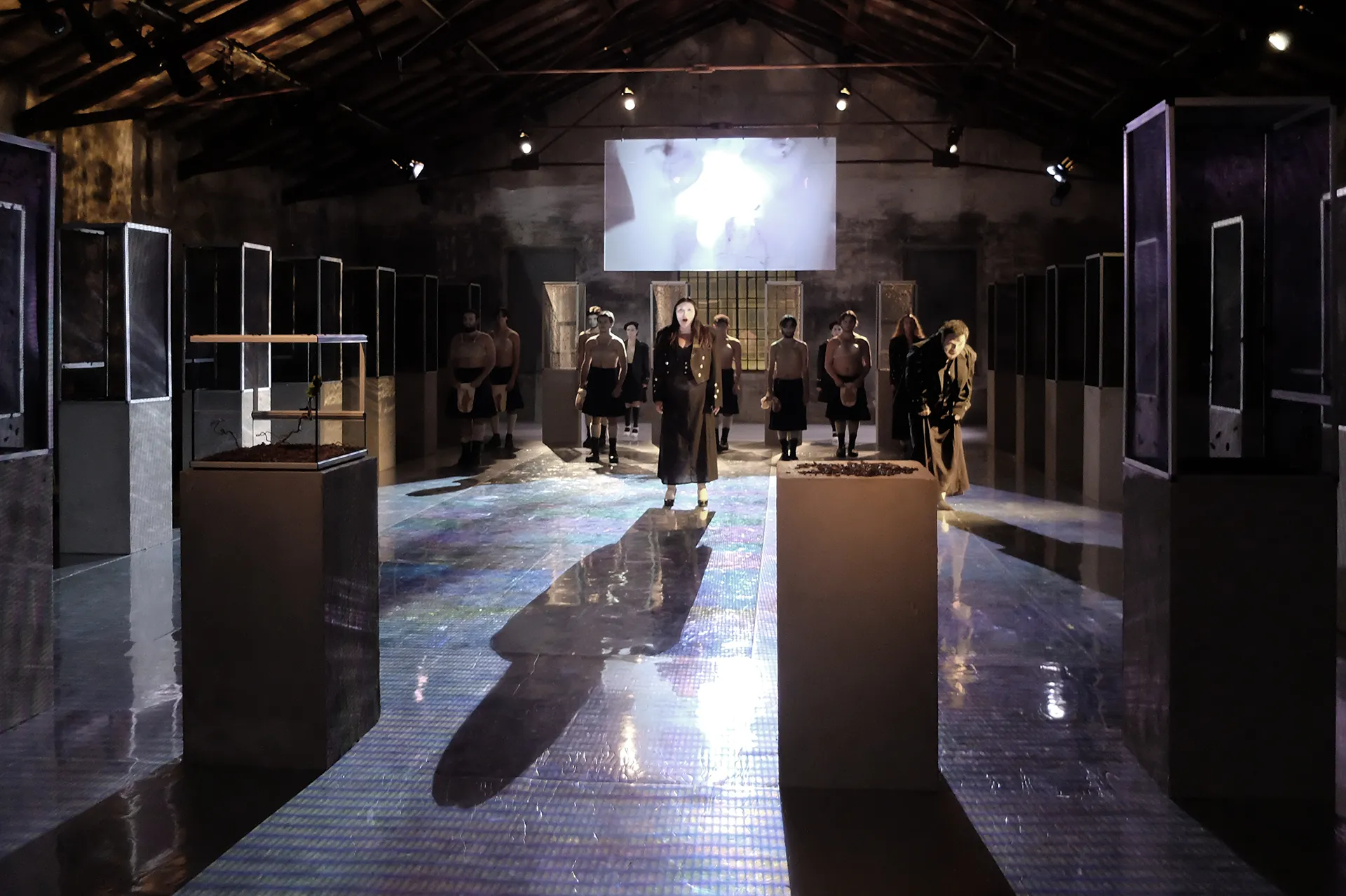 L’installazione del Verdi Macbeth è composta da ventiquattro terrari abitati da migliaia di grilli e insetti vivi il cui frinire costituisce, insieme alle voci verdiane, il materiale sonoro dell’opera. Lo spazio scenico riproduce la struttura architettonica dell’antico santuario dedicato al culto di Hecate – divinità che regna sui demoni e sui morti – funzione drammatica fondamentale dell’opera shakespeariana. Nell’area sacra il continuum ossessivo del canto dei grilli si impossessa progressivamente dell’intero spazio sonoro, in un crescendo simmetrico alle ossessioni di Macbeth e Lady Macbeth. La natura entra nel disegno installativo dell’opera come un principio orrorifico fantastico e reale insieme. Il paesaggio interiore di tormenti, ossessioni e paure si fa prova, estensione sensibile del soggetto. L’ineluttabilità del ciclo morte-vita nella Phisis – principio e causa di tutte le cose – non attenua, non elude la responsabilità della colpa, ma ne dissolve la retorica eroica.